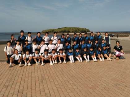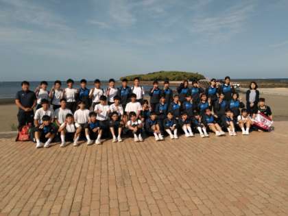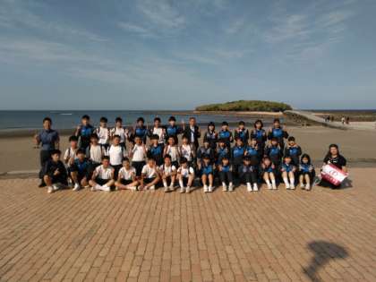 青島をバックに学級写真を撮影しました。