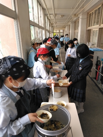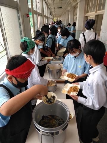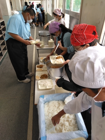午前の授業が終了し、給食の準備に入りました。