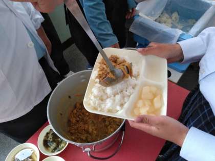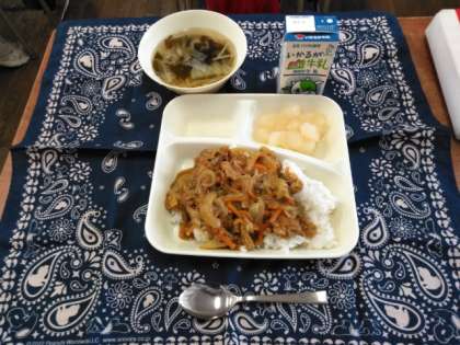わかめとキャベツのすまし汁、缶詰めのなしもついています。