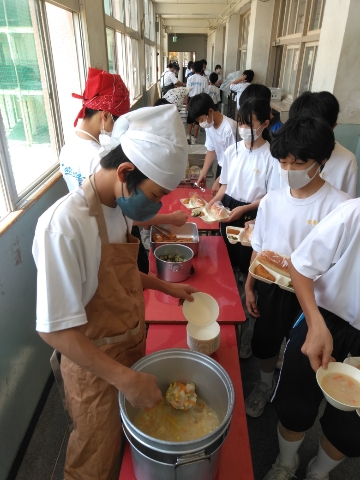 午前中の授業が終了し、給食の準備に入りました。