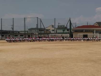 猛暑のグラウンドで、全体練習が始まります。