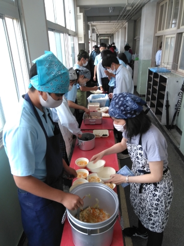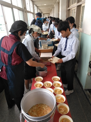 本日のメニューは、豚肉の胡麻味噌焼き、鶏肉と野菜のすまし汁、手作り海苔の佃煮です。
