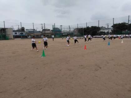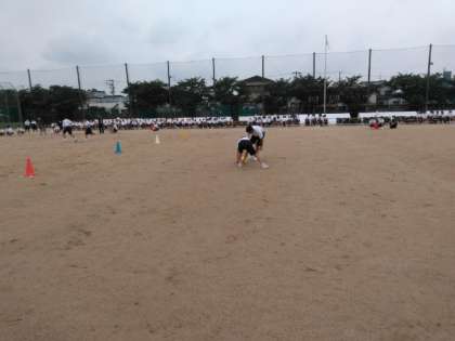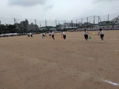 二人組で、上手にボールを運び、速さを競います。