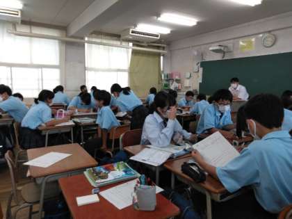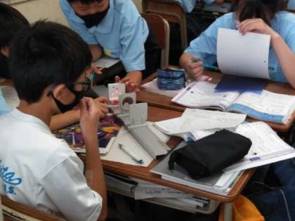 猛暑で理科室が使えず、教室に切り替えて実験です。