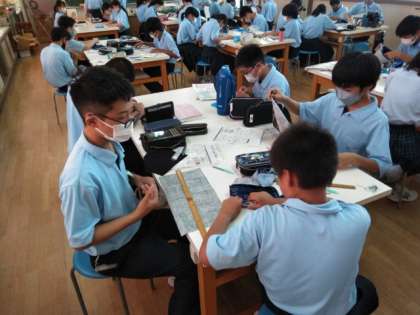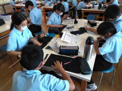 家庭科の授業で、ブックカバーづくりです。