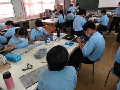 被服室は暑さが半端なく、生徒も先生も、汗をふきふき大変です。