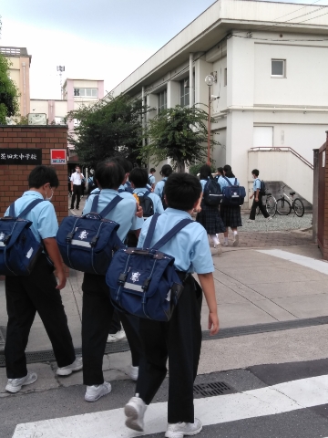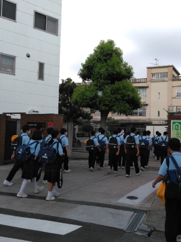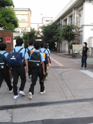 薄曇りの中、生徒たちが元気よく登校してきました。