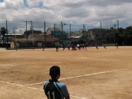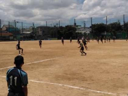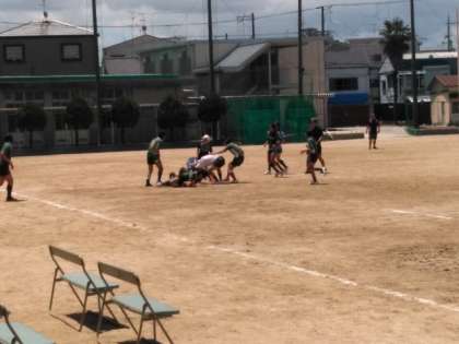 快晴のグラウンドでは、ラグビー部が練習試合を行っています。熱中症で倒れないように。
