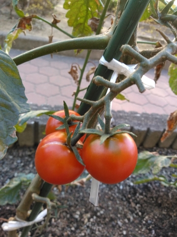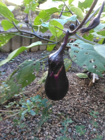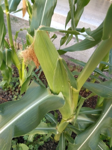 学校菜園のミニトマト、トウモロコシ、ナス。