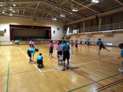 体育館では、バドミントン部が汗を流しています。