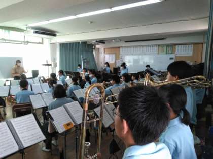 音楽室では、吹奏楽部が練習に励んでいます。