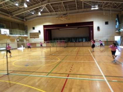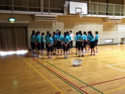 体育館では、バドミントン部が練習しています。