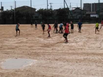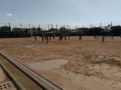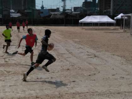 少し水の引いたグラウンドでは、ラグビー部が練習しています。