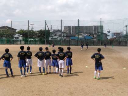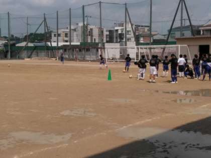 水溜まりの残るグラウンドでは、サッカー部が練習しています。