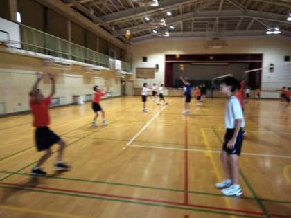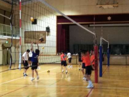 体育館では、男子バレーボール部が練習しています。