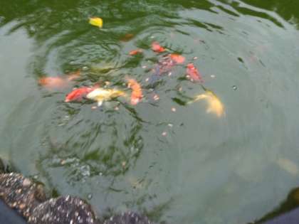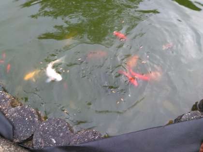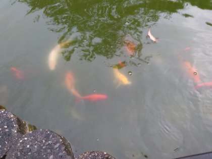 雨が上がり、錦鯉がエサを求めて集まって来ました!