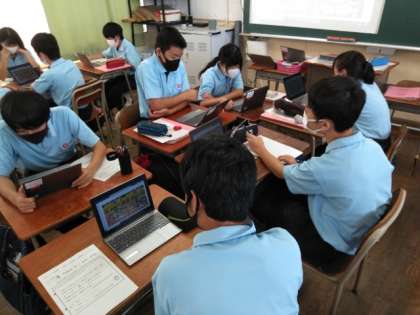 新しい範囲の文法の理解のため、タブレットを活用し、班学習で間違い探しから取り組んでいます。