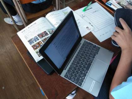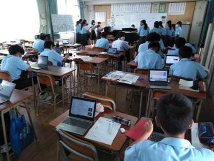 女子は合唱練習、男子はタブレットで、郷土の芸能・祭りの調べ学習です。