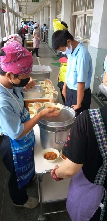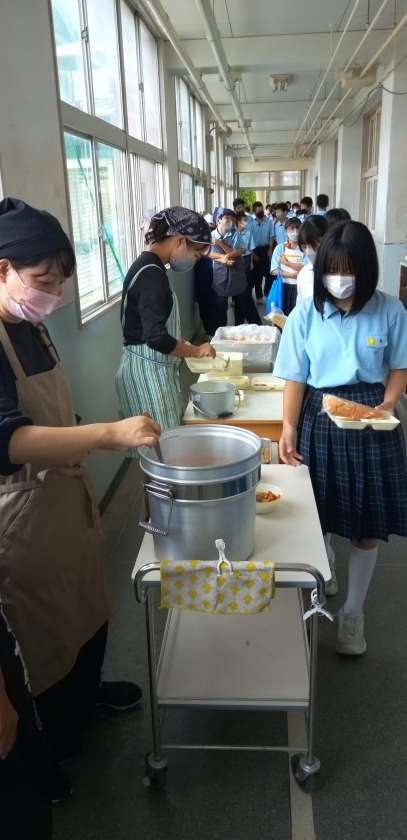 午前中の授業が終わり、給食の準備に入りました。