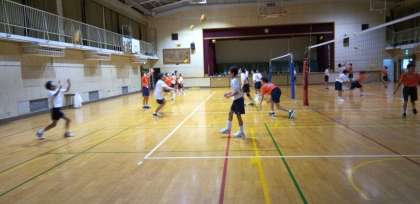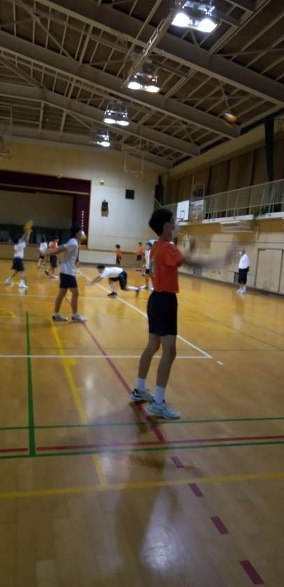 体育館では、男子バレーボール部が練習しています。