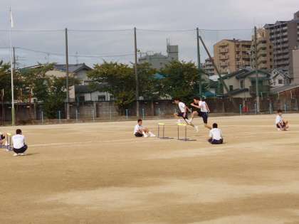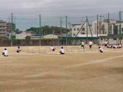運動場で、ハードル走に取り組んでいます。