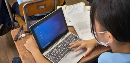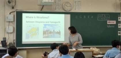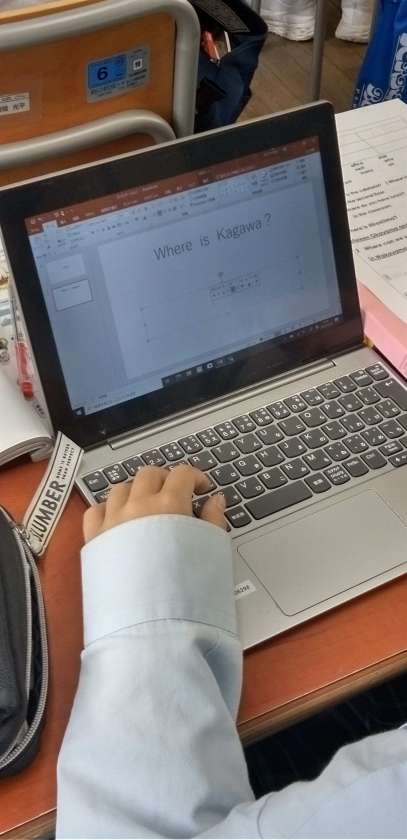 本時のめあてが提示され、Whereの活用、タブレットを使って、パワーポイント作成です。