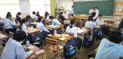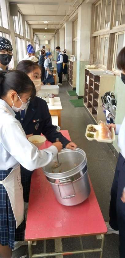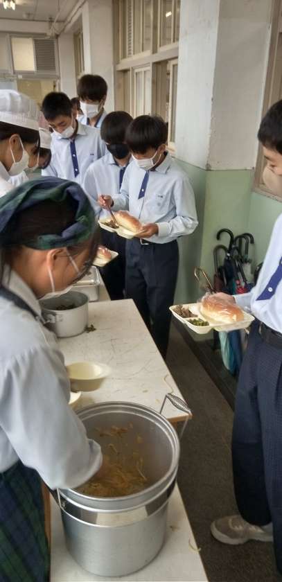 午前中の授業が終わり、給食の準備に入りました。