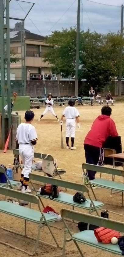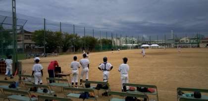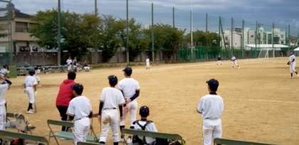 グラウンドでは、野球部が練習試合を行っています。