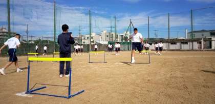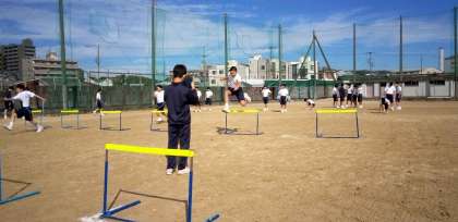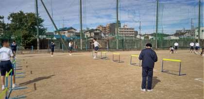 班ごとに、ハードルを跳び越える空中姿勢を動画に撮ります。