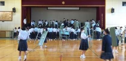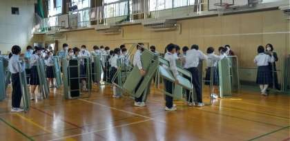 2年生は体育館で、舞台の仮設営を行っています。