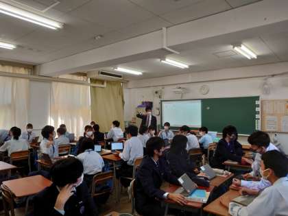 グループに分かれて、タブレットを使って学習しています。