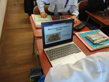 タブレットに提示された疑問文をみんなで答えています。