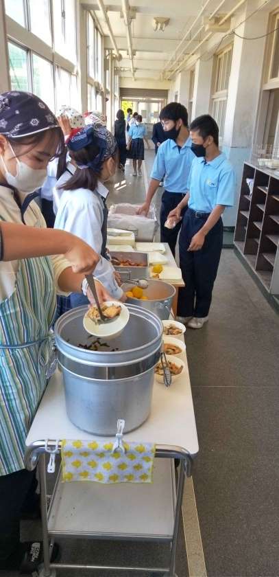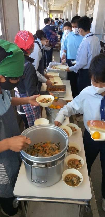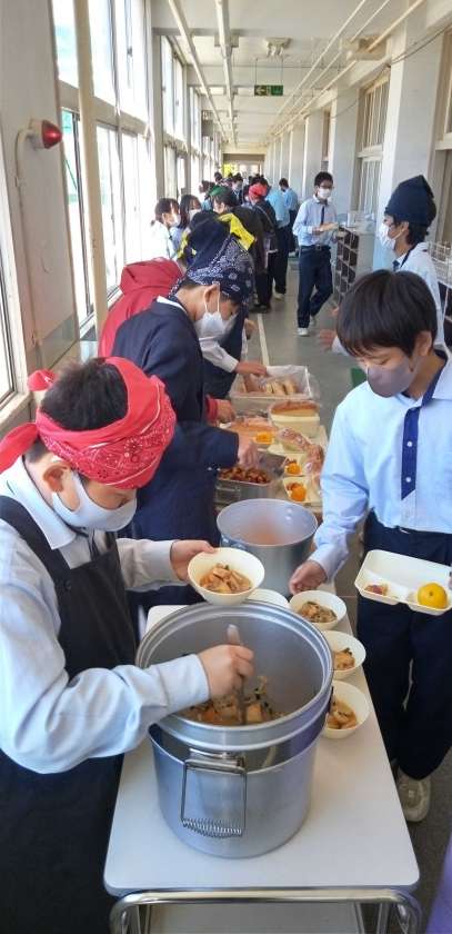 午前中の授業が終わり、給食の準備に入りました。