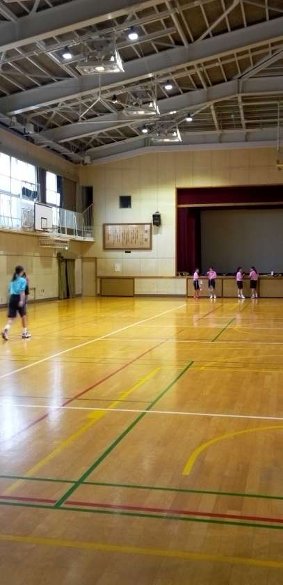 体育館では、バドミントン部がフットワークを終えて、実戦練習に入ります。