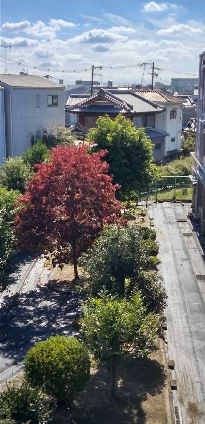 ハナミズキの紅葉が、太陽の輝きに映えています。