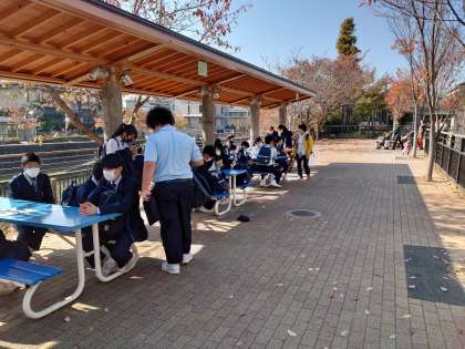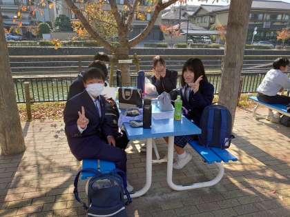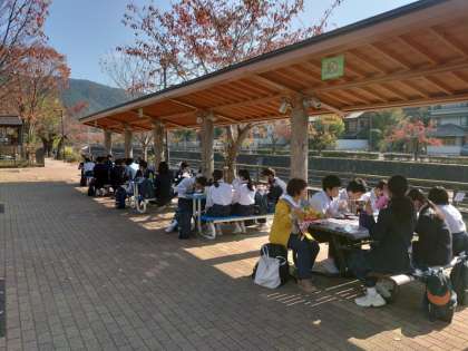 いい天気の中で、校外での食事。食事が進みます。