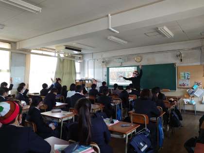 本日は、C-NETの先生が来られています。12月の雰囲気を出すために、サンタさんの恰好をして授業をしています。楽しい雰囲気で英語を学んでいます。