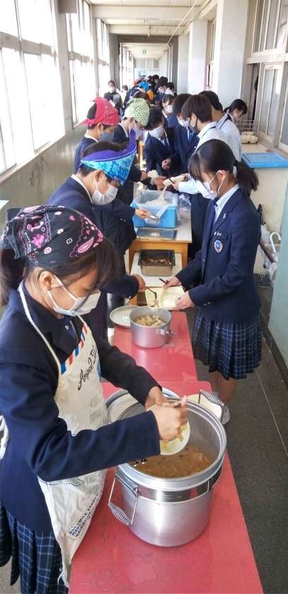 午前中の授業が終わって、給食の準備に入りました。