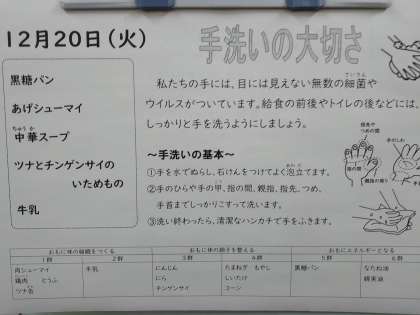 私たちの手には、目には見えない無数の細菌やウイルスがついています。給食の前後やトイレの後などには、しっかりと手を洗うようにしましょう。