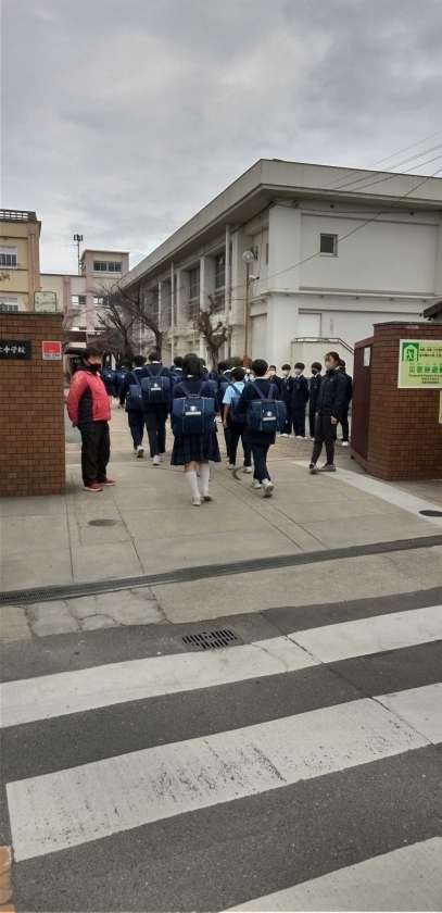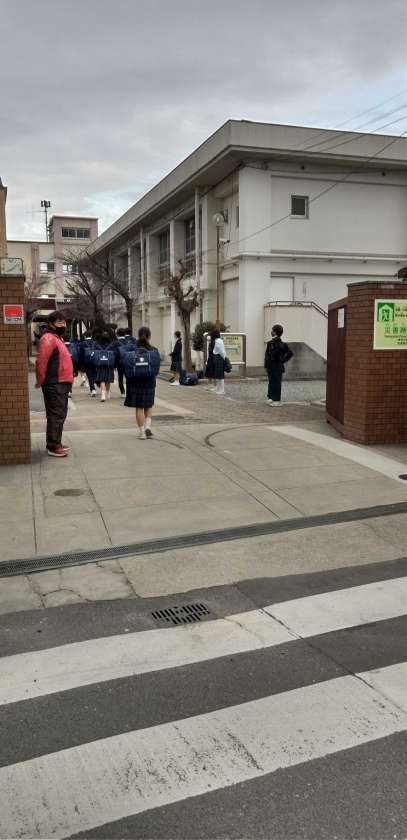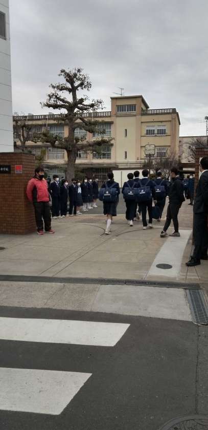 曇り空の中、生徒たちが元気に登校して来ました。