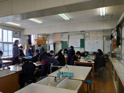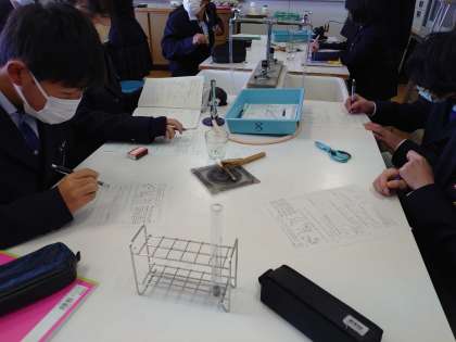 化学変化について学習しています。この時間は、鉄と硫黄の混合物を加熱した時の変化について調べています。
