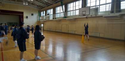 女子体育。体育館でのバスケットボールの授業です。