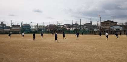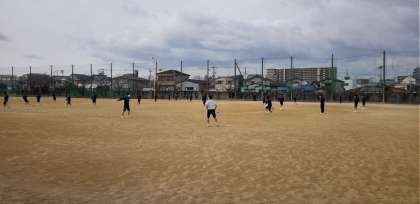 男子体育。グラウンドでサッカーの授業が行われています。