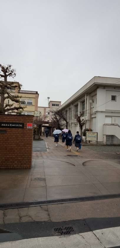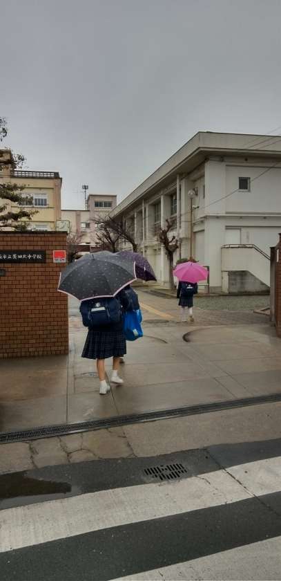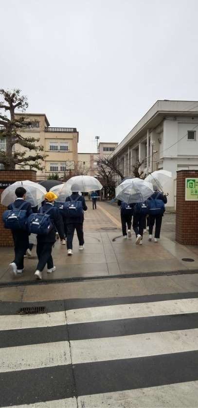 冷たい雨の中、生徒たちが登校して来ました。