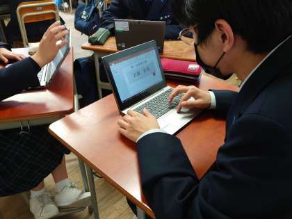 地理分野、歴史分野、公民分野などの今まで学習した内容をさらに深めていくために、タブレットを使って調べ学習を行っています。