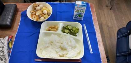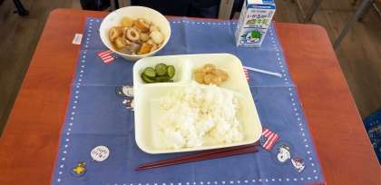 本日のメニューは、「鶏肉・うずらと野菜の関東煮」「きゅうりの梅風味」「白花豆の煮物」です。