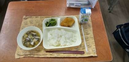 本日のメニューは、「鱈フライ」「鶏肉と野菜のすまし汁」「小松菜の胡麻和え」です。