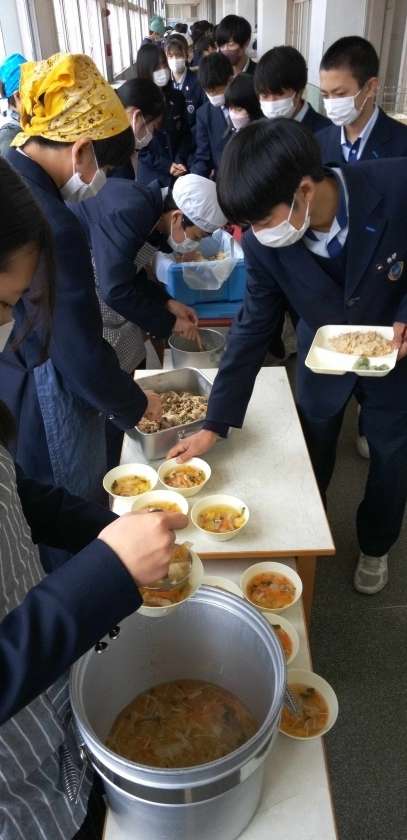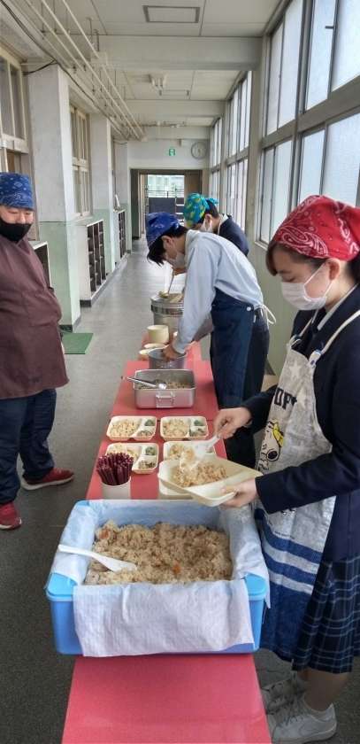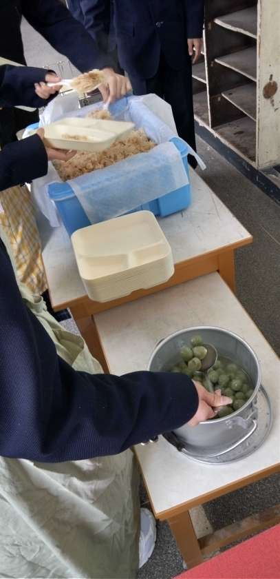 本日のメニューは、「かやくご飯」「豚肉と野菜の炒めもの」「鶏肉と野菜のすまし汁」「よもぎ団子」です。