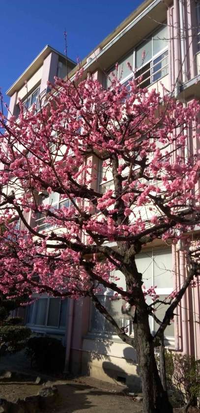 日の光を浴びた紅梅。