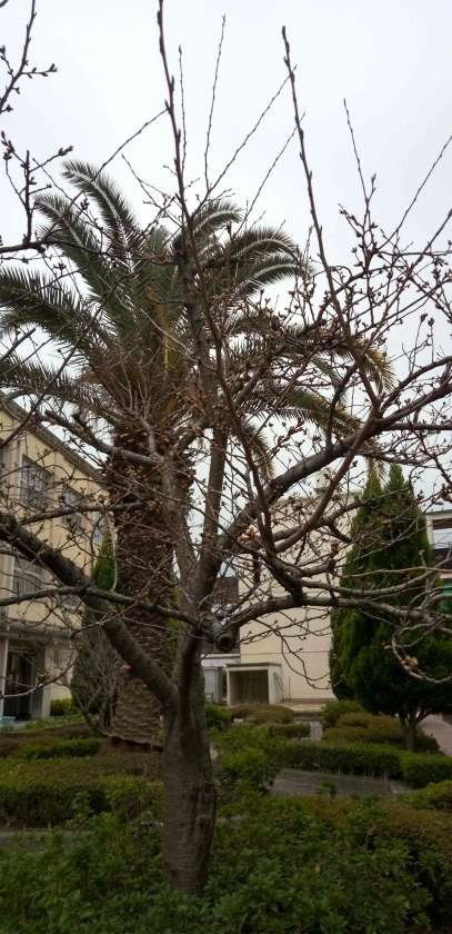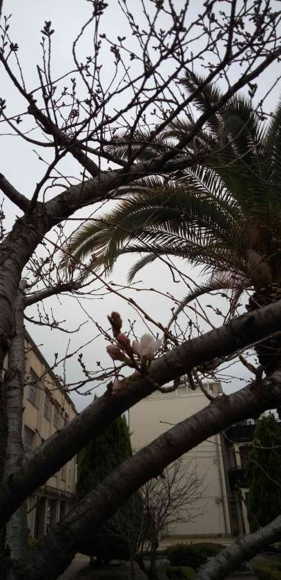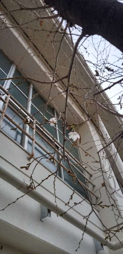 昨日の暖かさで、中庭や体育館前のソメイヨシノが、ついに開花しました!